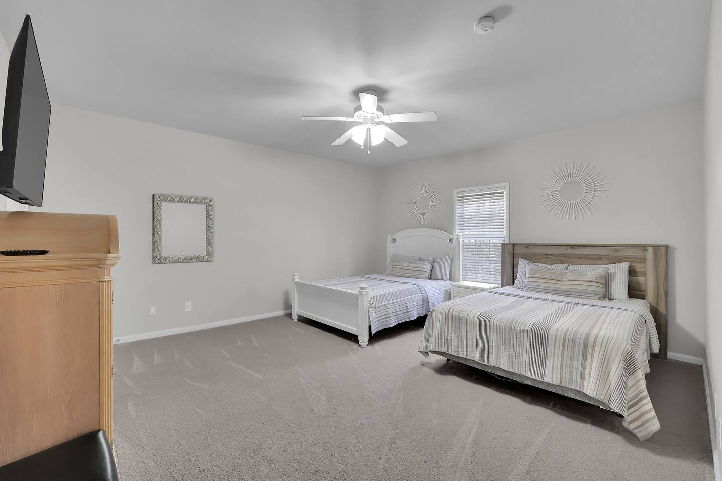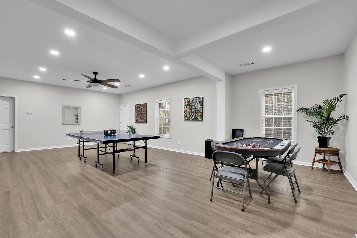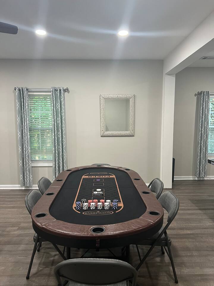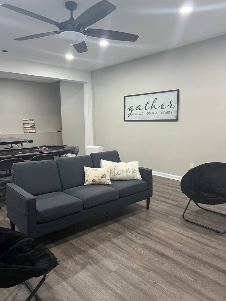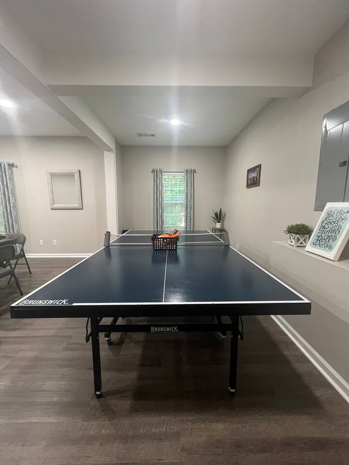 In our home, guests will find 4 bedrooms with 1 king, 4 queen sized beds and 3 twin floor mattresses. The master bedroom has a private, en-suite bathroom with a walk-in closet. In the living room, you will find a lovely fireplace, a big screen smart TV and plenty of seating. Stocked kitchen, stainless steel appliances and granite counter tops. There are 4 more smart TVs with streaming capabilities. Washer and dryer on site. Ample parking- a two-door garage and a driveway big enough for 4 cars. House is ranch style with a finished basement. Entertain your guests with a poker table and chips, a ping pong table, enjoy a cup of coffee or your favorite beverages on the lovely back porch where you can listen to the birds chirping in the woods. Please remember this is our house that we care about and love so much! So please treat the space with respect, love, and kindness by keeping the space clean before you leave (respect our properties in the house). We really appreciate your understanding and cooperation in advance. Have a nice trip and enjoy your stay! Note: We are in the process of landscaping, so there are twigs and branches in the backyard. No fires allowed, please.